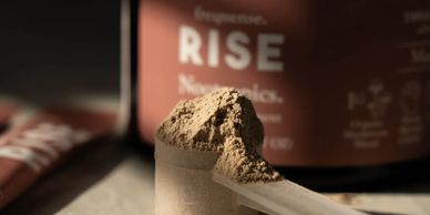 Next, I mix Rise into my morning drink. Rise is designed to support mental clarity, mood, and clean energy with ingredients such as organic mushrooms, B-vitamins, and green coffee bean extract.